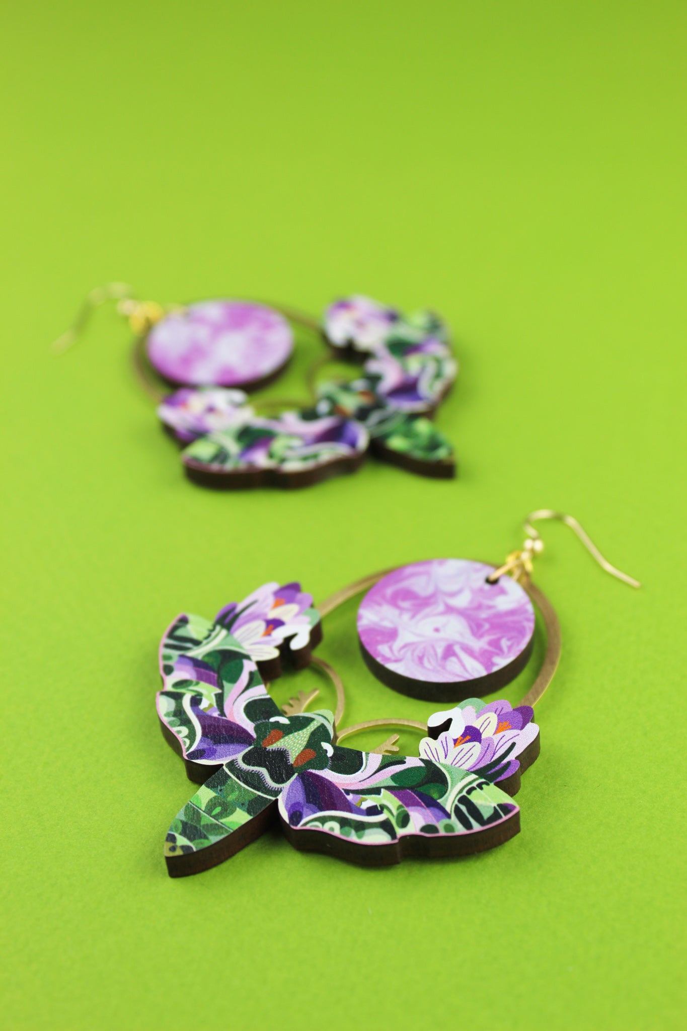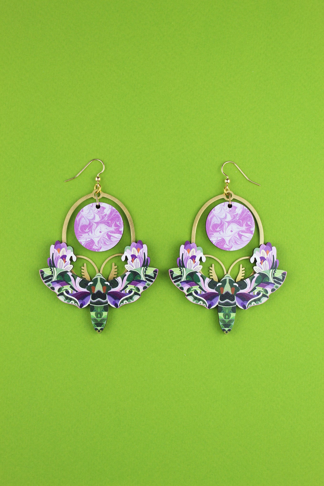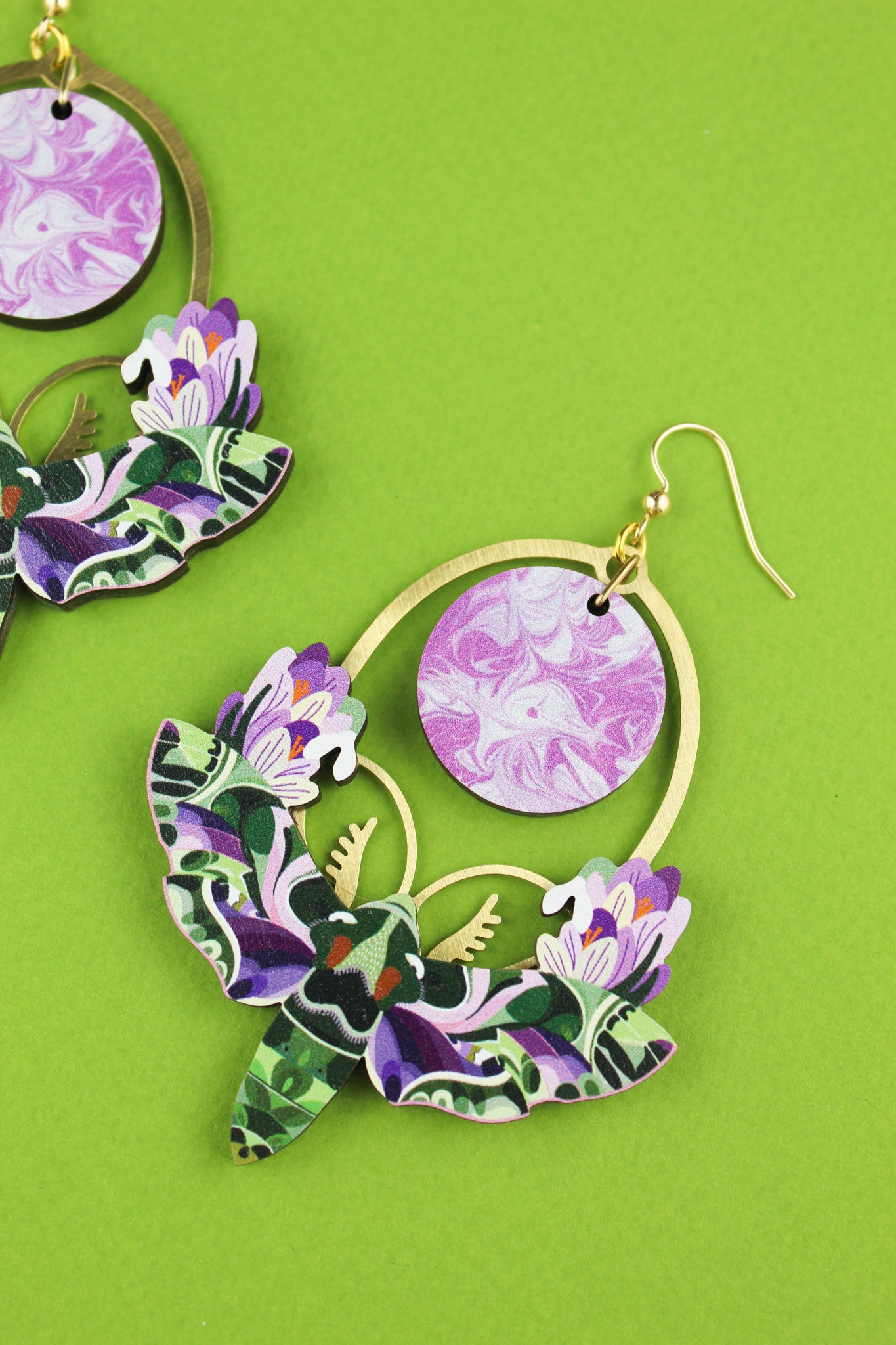 Magnifiques boucles d'oreilles tendance en laiton brut et bois de cerisier. Composées d'un sphinx du laurier-rose volant sous une lune rose marbrée, surmontée d'une arche en laiton et de fleurs de crocus.