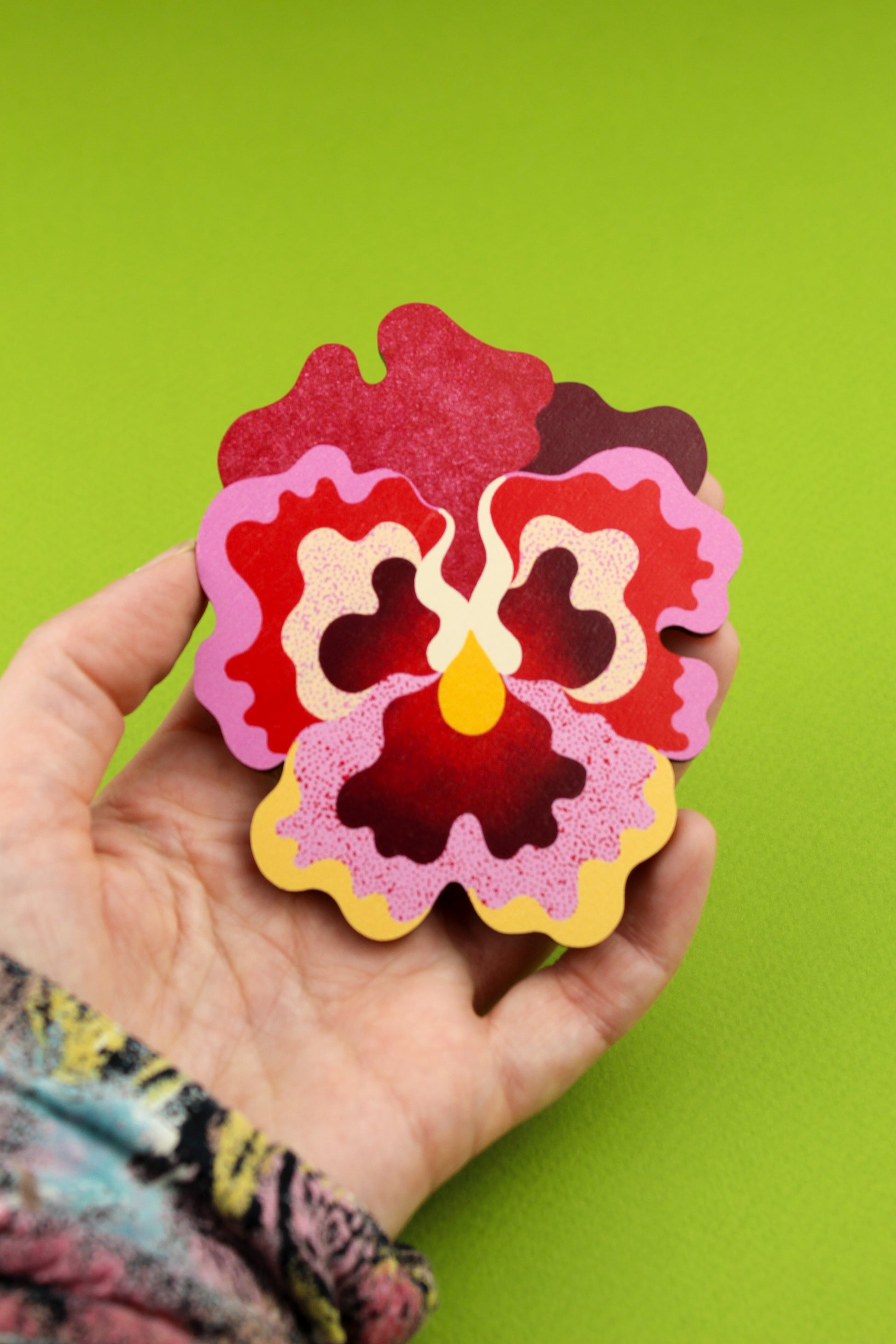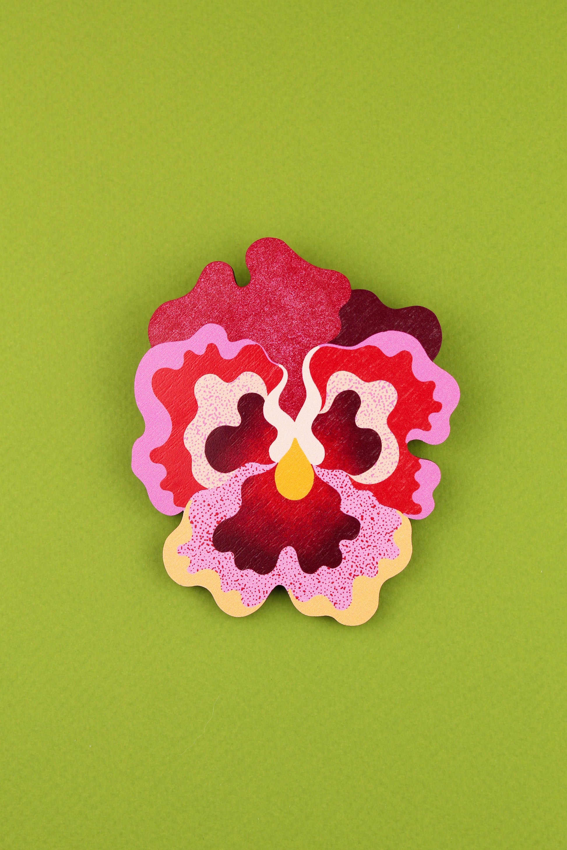 Cette broche flamboyante est inspirée de la belle pensée à froufrous et présente des textures funky et des couleurs vibrantes comme la vraie chose.