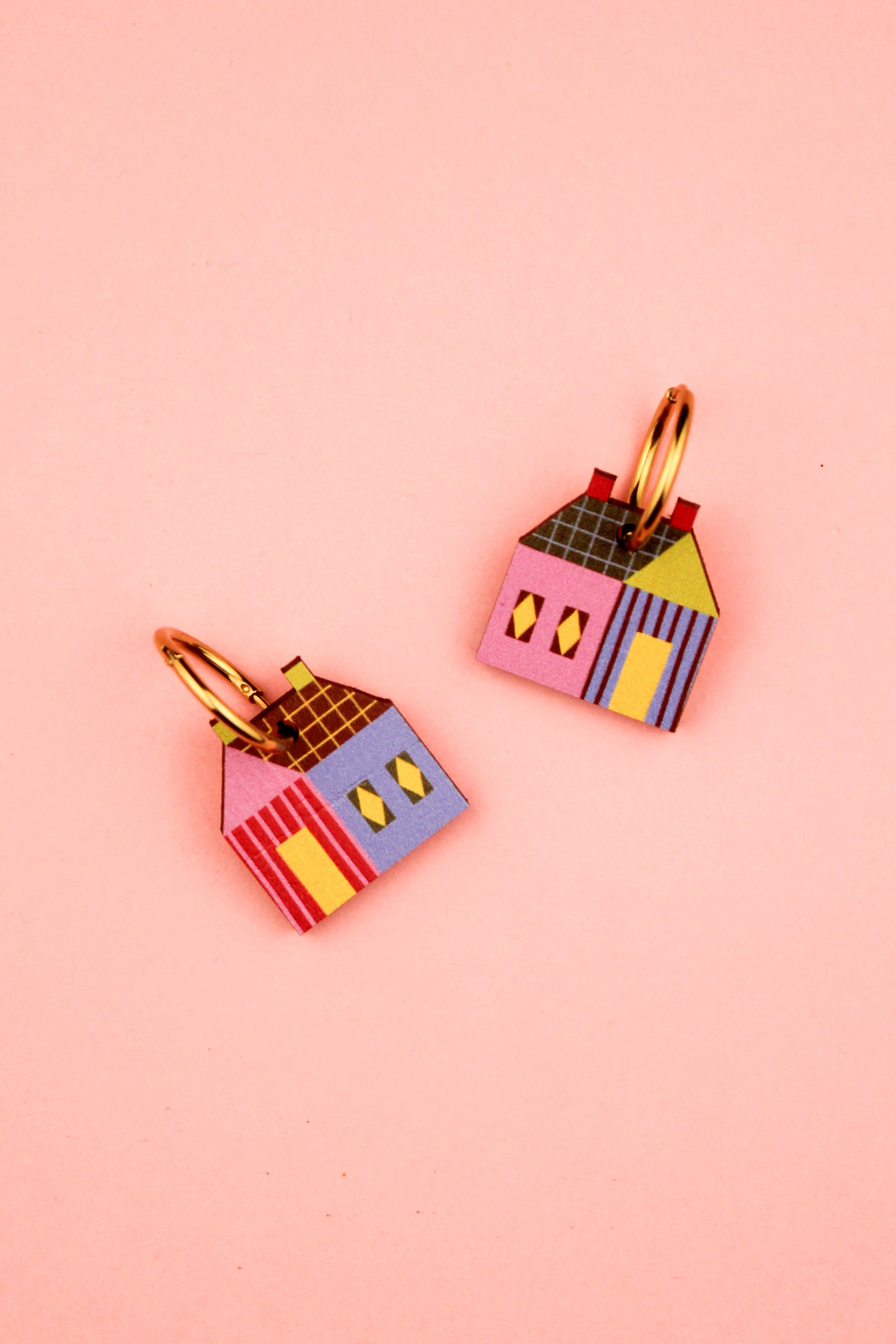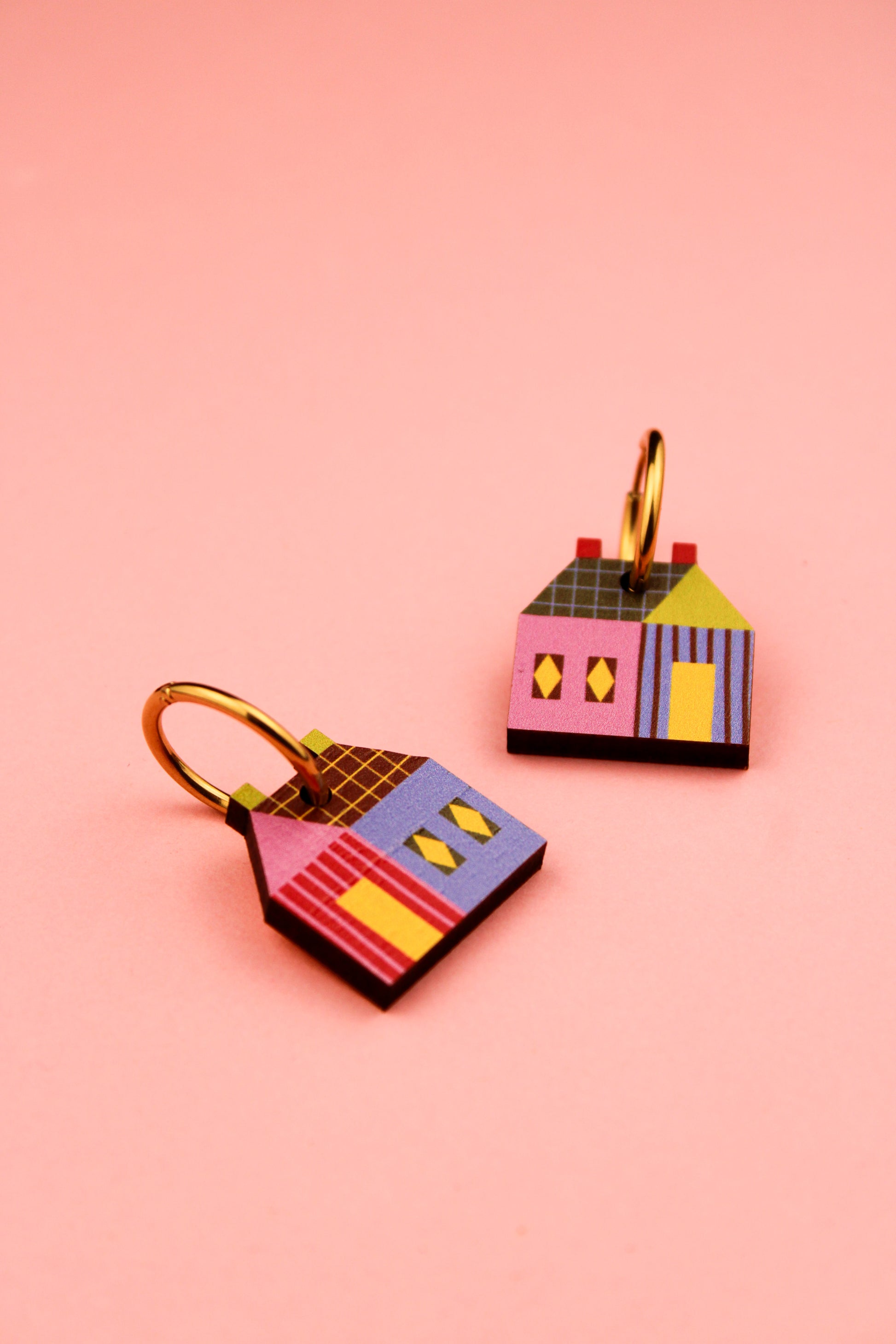 These mismatching house hoops are so cute! Their shining yellow windows and colourful patterns make for a cosy reminder of home. They are inspired by traditional house quilt blocks and will lend a crafty playful vibe to any outfit.