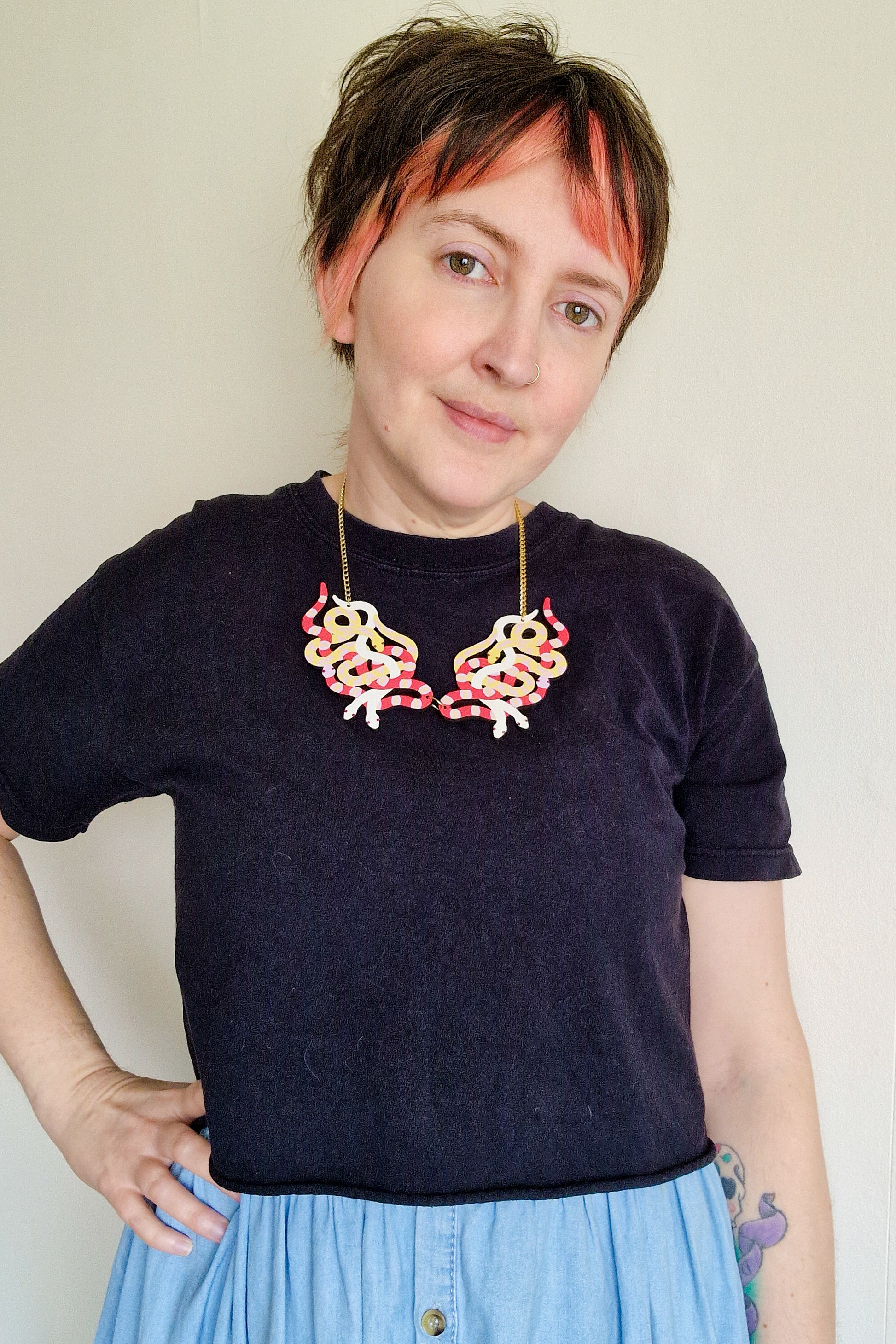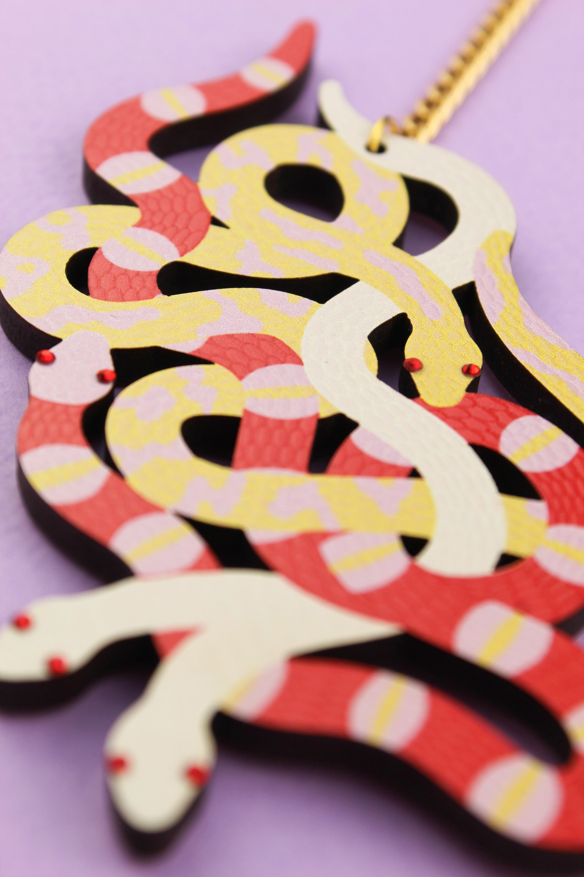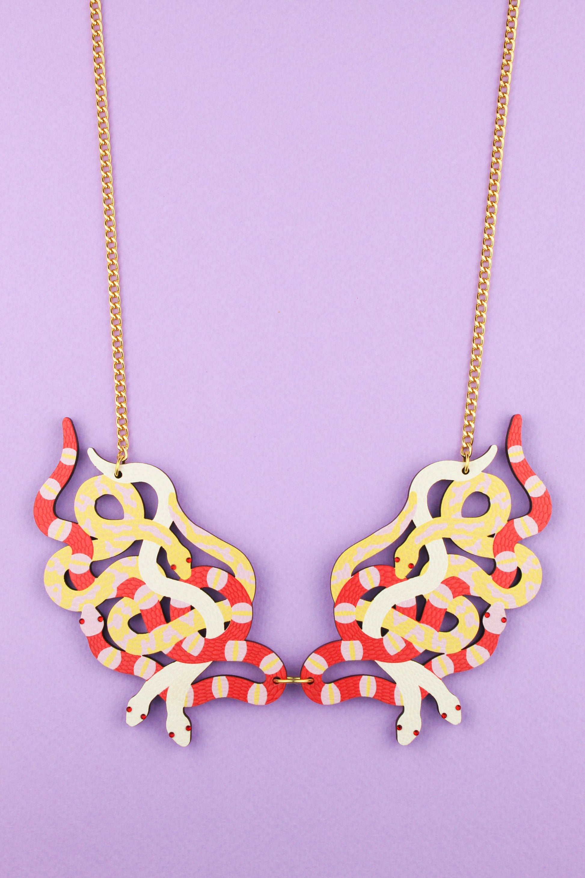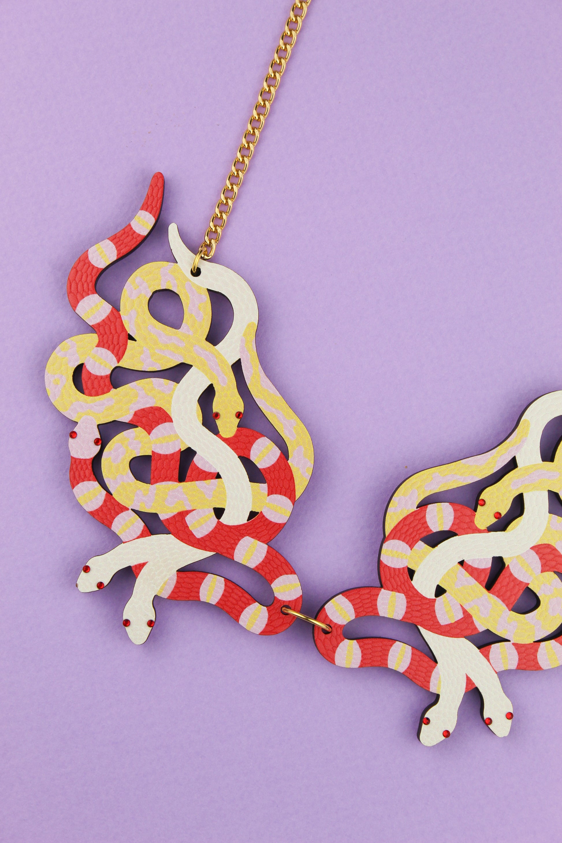 Inspired by albino milk snakes this necklace features, a tangle of white, yellow and pink and red snakes, finished with sparkling red crystal eyes.