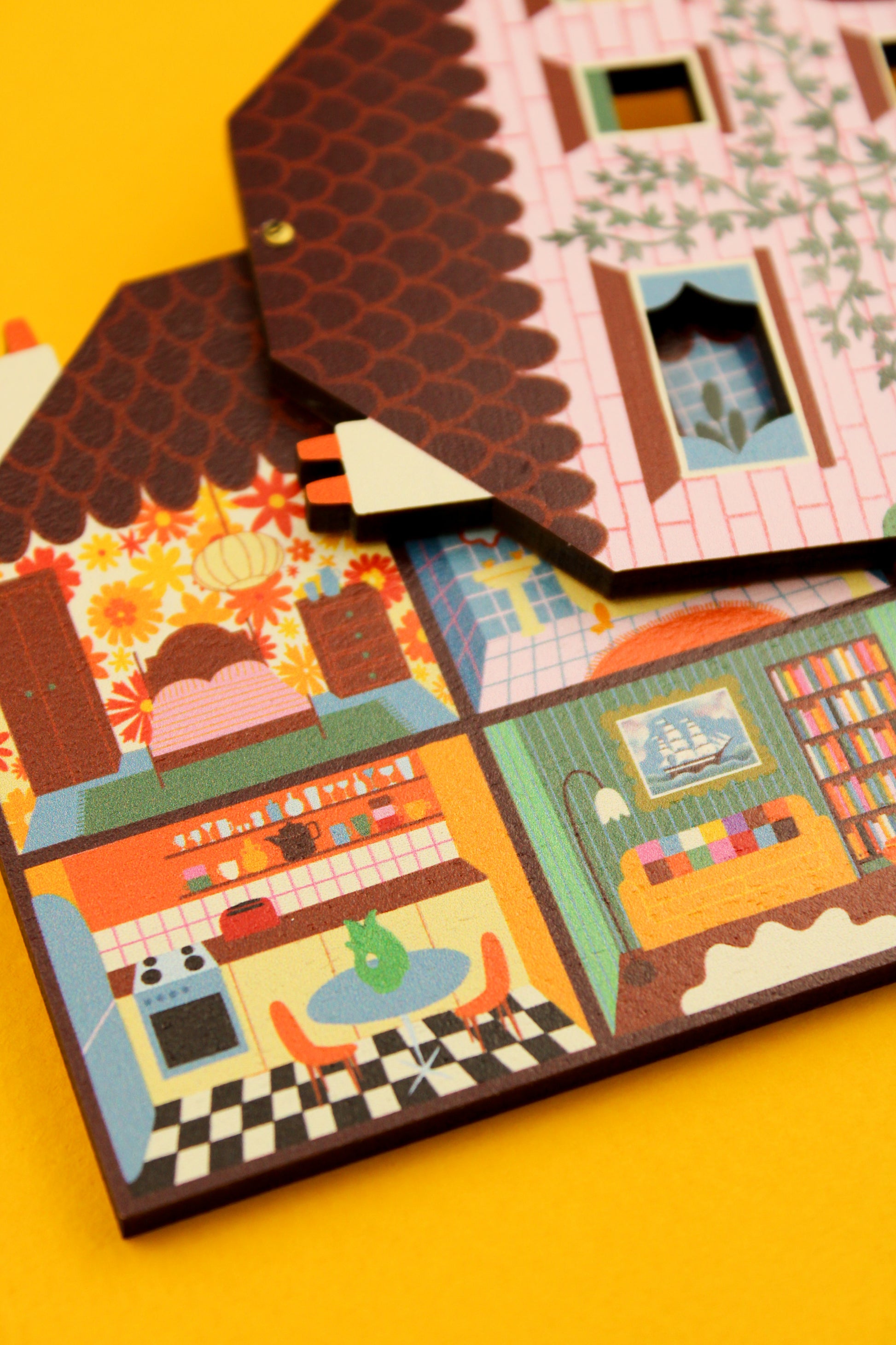 This cosy articulated house brooch is inspired by wooden dolls houses and retro interiors. Made from two pieces of printed maple wood veneer and held together by a sturdy pin allowing the front of the house to be lifted and all the little rooms to be revealed.