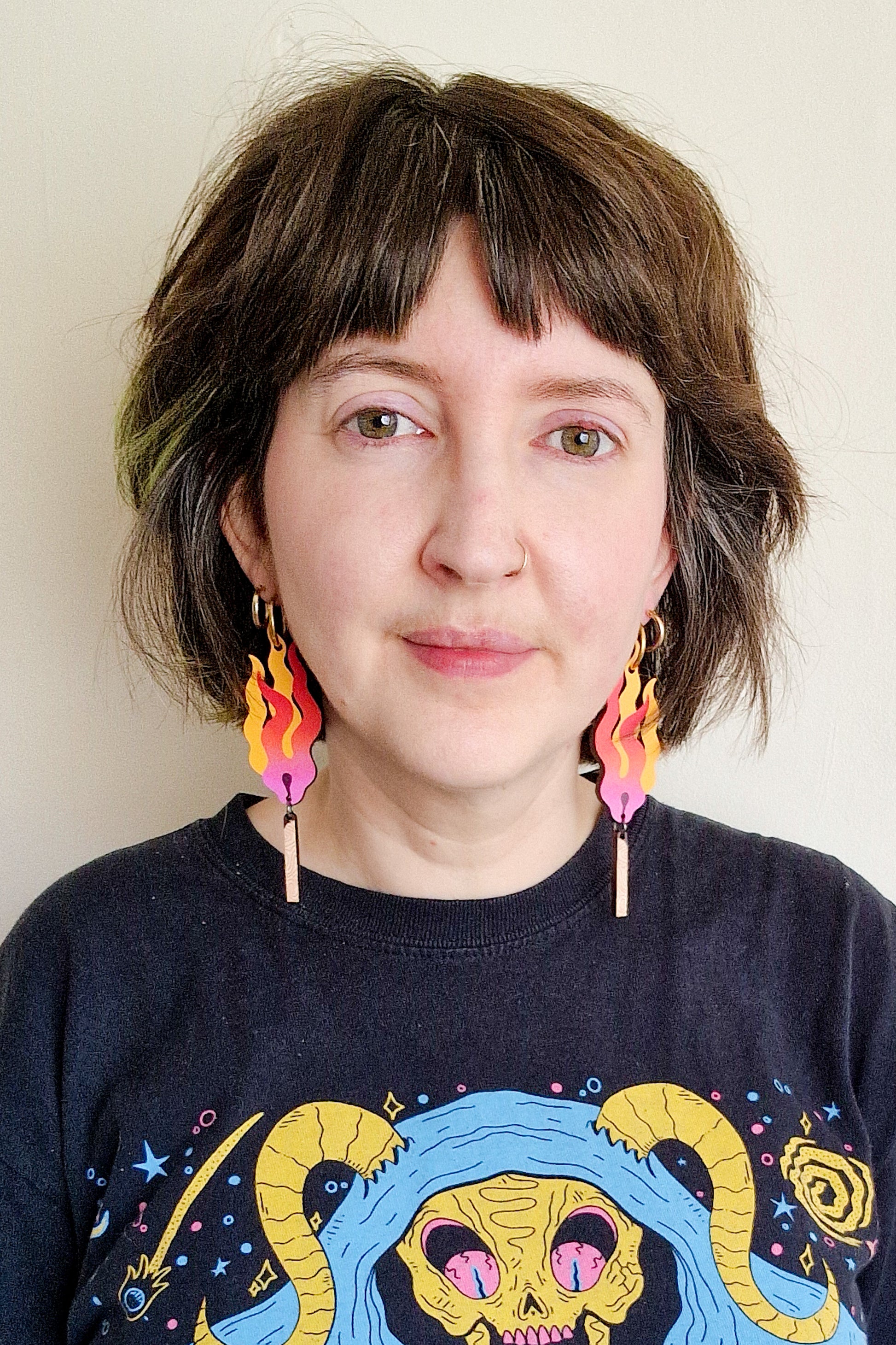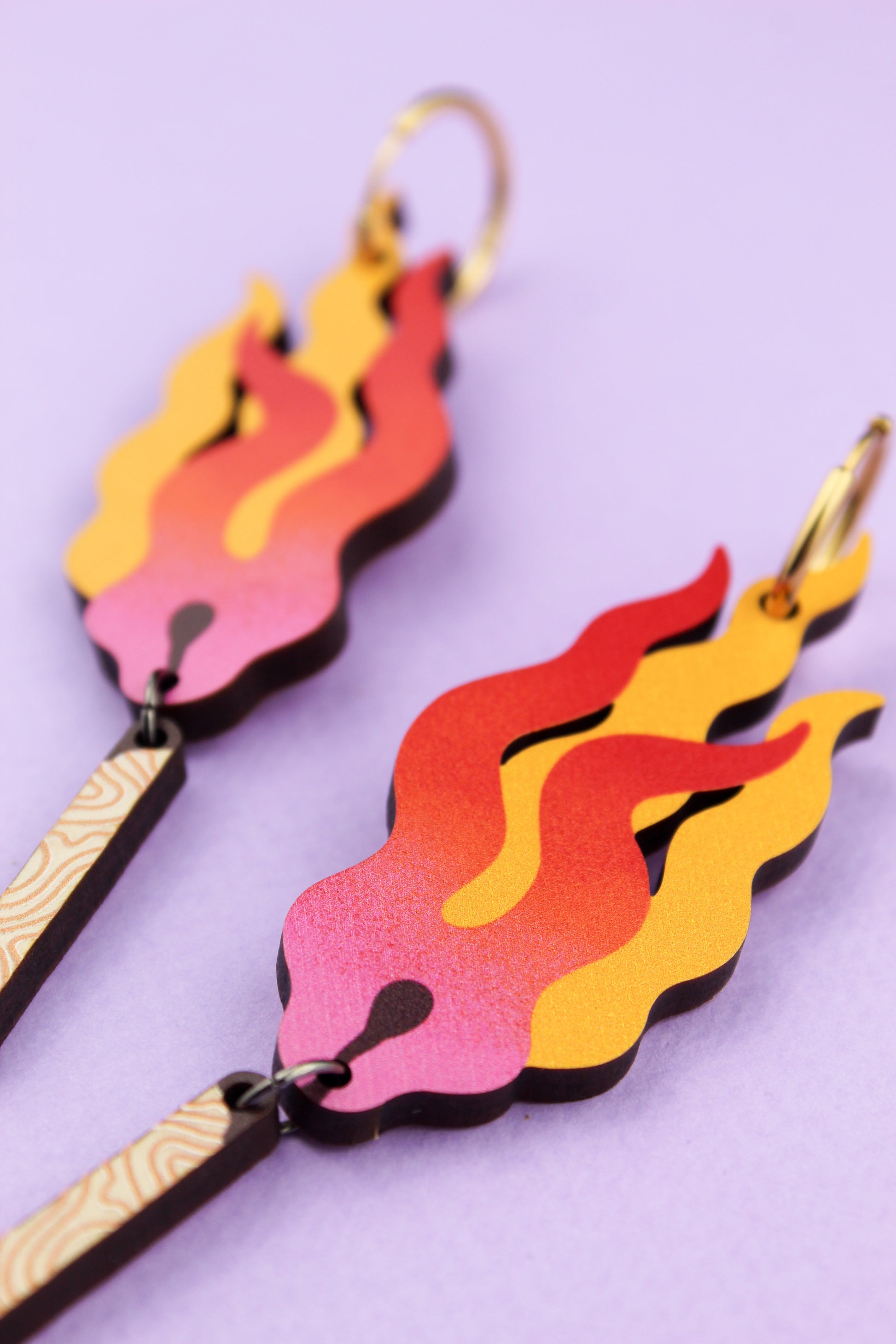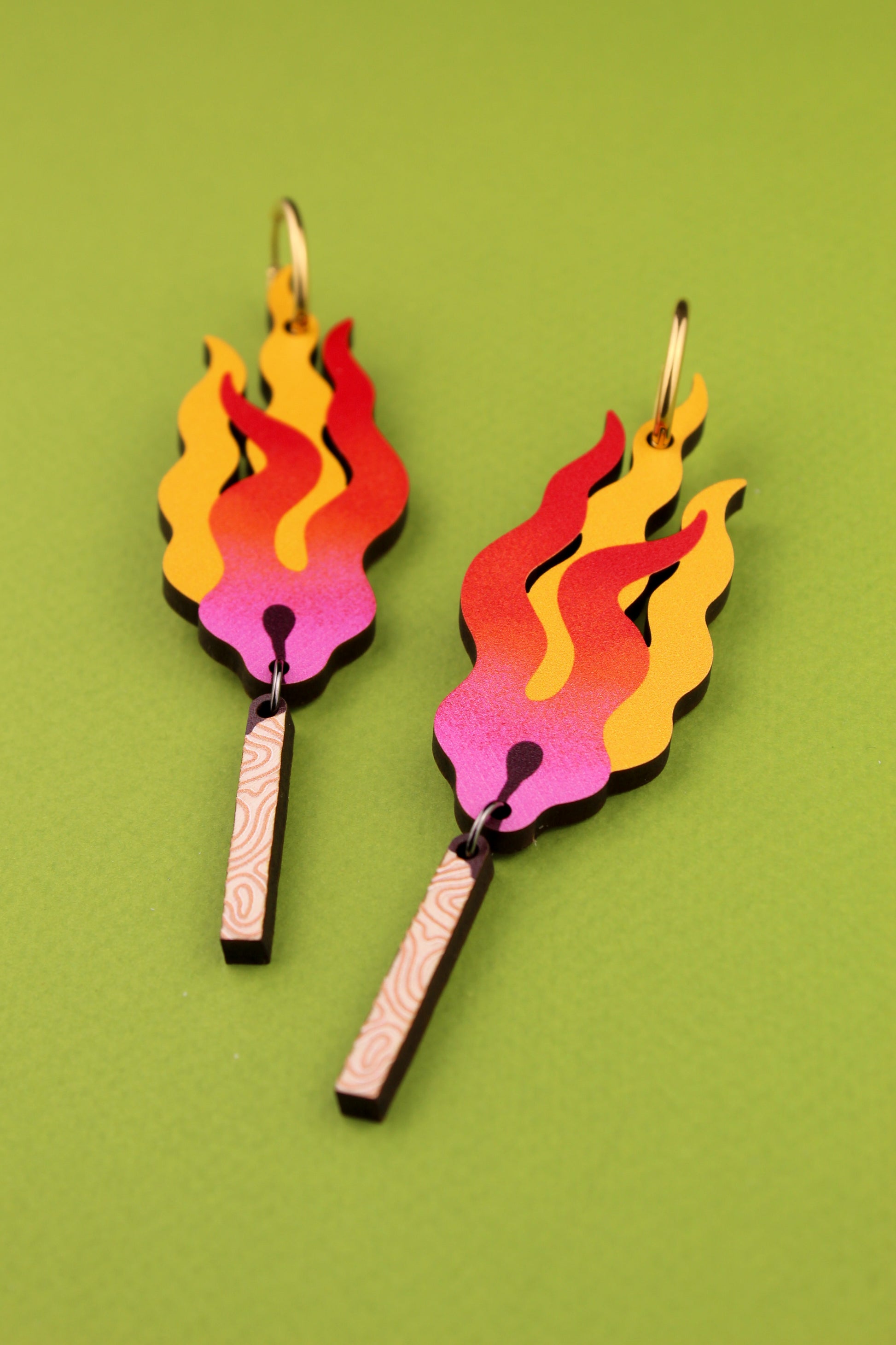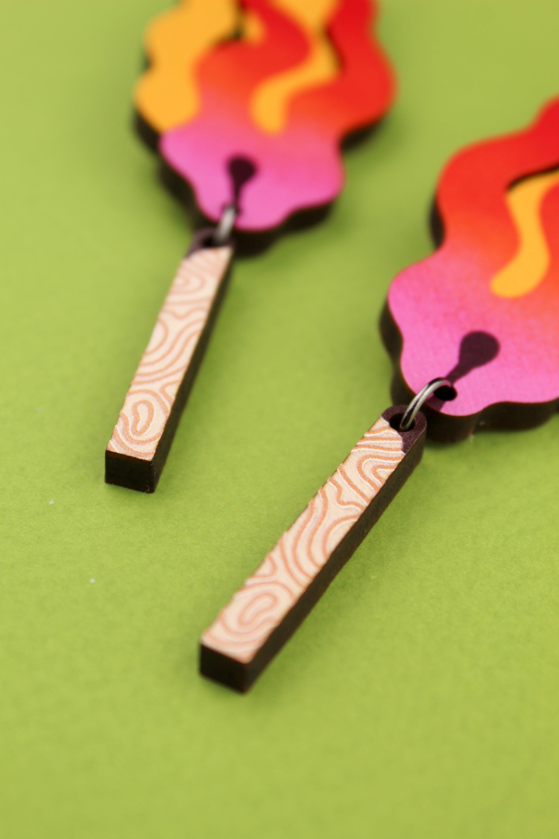 Lit matchstick statement earrings made of printed cherry wood, featuring lit matches with bright pink, red, orange and yellow flames.