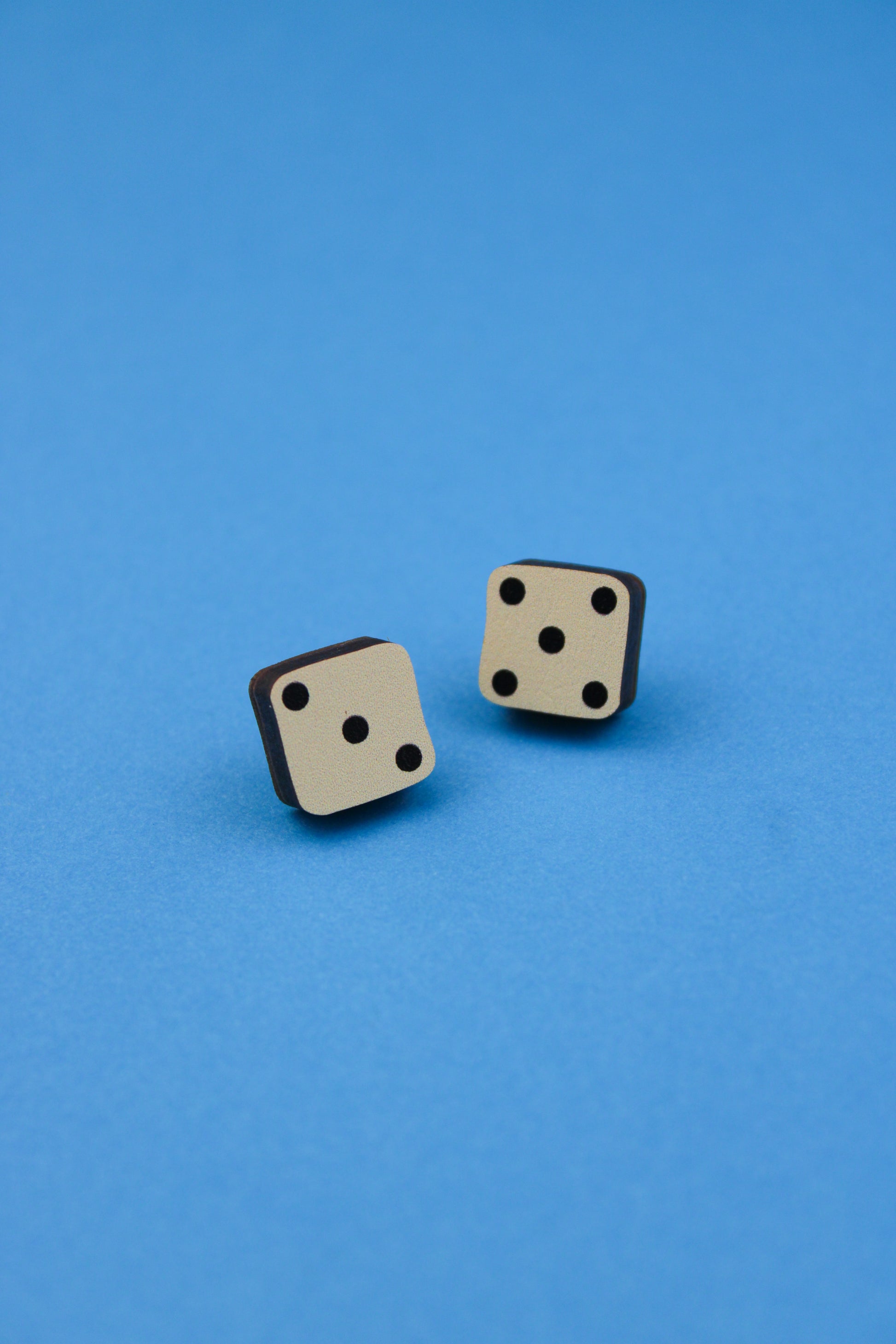 Each die is made of printed maple wood veneer with a stainless steel stud secured to the back.